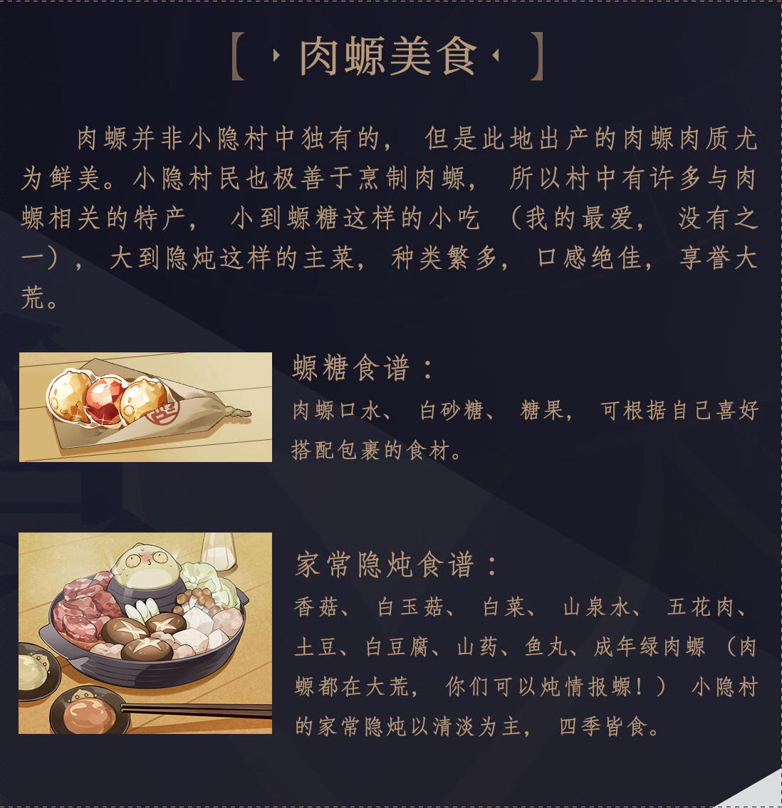 肉螈并非小隐村中独有的,但是此地出产的肉螈肉质尤为鲜美。小隐村民也极善于烹制肉螈,所以村中有许多与肉螈相关的特产,小到螈糖这样的小吃(我的最爱,没有之一),大到隐炖这样的主菜,种类繁多,口感绝佳,享誉大荒。