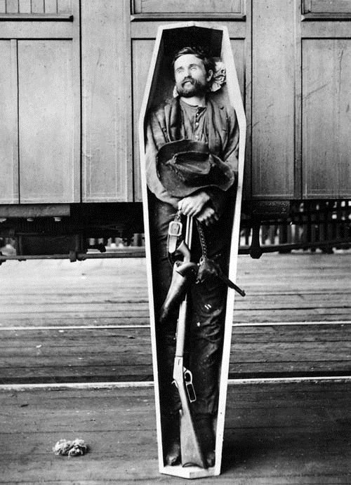 一名死亡的西部枪手,他的棺木中装着他最好的伙伴——两把手枪和一把步枪