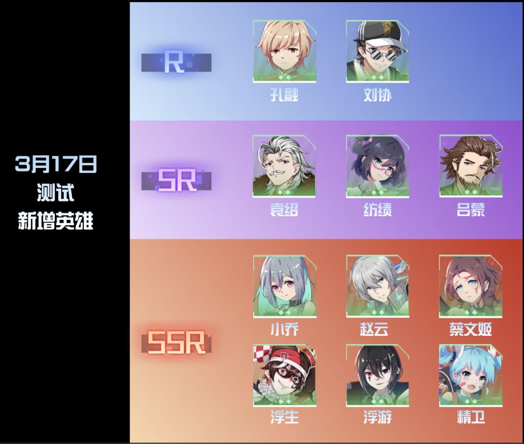 一共增加11个英雄,其中纺绩,吕蒙都是隐藏SR,就是可以升SR的R。赵云是隐藏SSR,就是可以升SSR的SR。抽到纺绩不要扔啊,我个人很喜欢她,是个十分好用的奶妈。