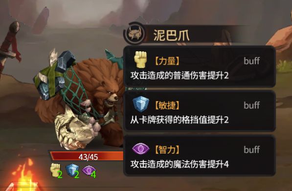 不同的角色有不同的玩法、不同的策略。泥巴爪作为战士,打架就是硬碰硬,他的卡牌几乎都属于物理伤害,比如普通攻击、冲锋、趁虚而入等等,但是攻击与攻击也是不一样的。