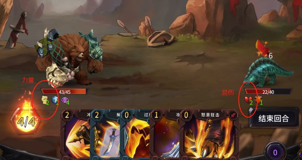 力量:让泥巴爪的普通伤害提高,比如2点力量,出一张4点普通攻击的卡牌能打出2+4点伤害,常见于装备中,可以持续加力量;偶尔也有加临时力量的卡牌,比如:暴怒,就能让泥巴爪获得2点临时力量;