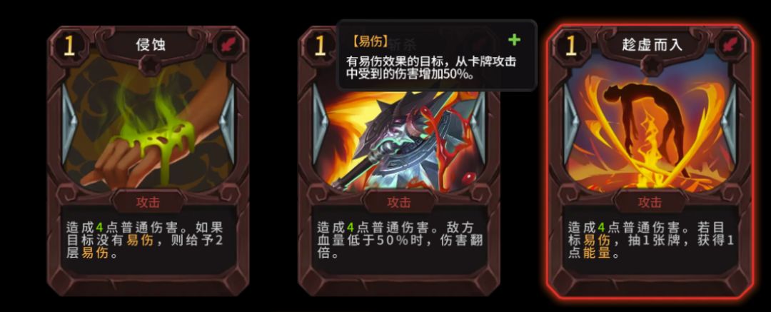 易伤:在敌人身上堆叠易伤,同样能让泥巴爪打出的伤害提高;易伤增加50%伤害,同时按持续回合算,所以每轮先出有易伤的牌会提高普攻的伤害;当怪物有易伤时,与某些牌配合能打出相当惊人的效果,比如:趁虚而入。