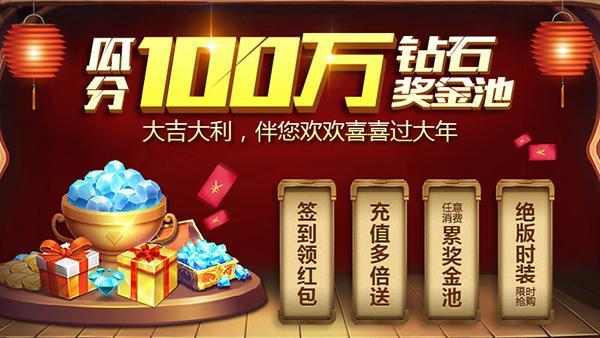 2018年春节即将来袭,给大家准备了丰厚的节日奖励,凡是在春节活动期间,登录,任意消费钻石,充值的小伙伴们,可以每天一同瓜分百万钻石奖励,最高可达到20倍的钻石哦,相信小伙伴们都很期待吧!大家千万别错过了!
