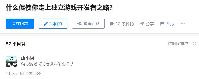 问题是:什么促使你走上独立游戏开发者之路?结果就在最新回答里面看到了一只大傻熊头像。哟!这不是丛林节奏制作人嘛。于是好奇心驱使我看下去......