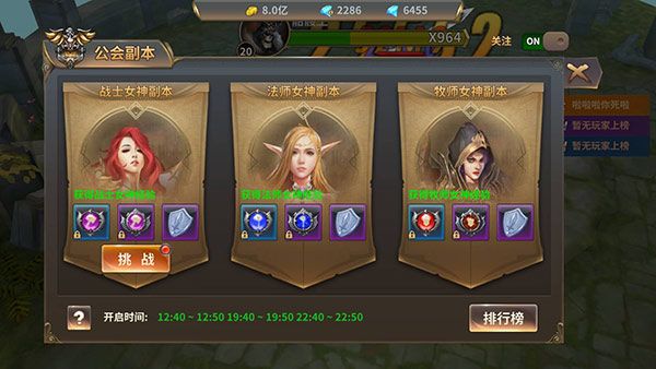 注意,只有公会的管理才有资格开启公会副本。比如会长选择今天开启战士女神副本,那么公会的成员今天就只能挑战战士女神副本。