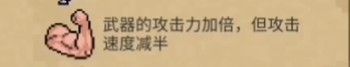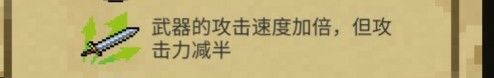 和攻速加倍,攻击力减半相反,一般武器不适用。推荐使用武器:弓箭类(不包括弩)、轨道炮类和地下水。