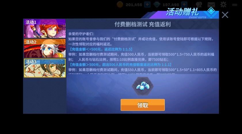 活动介绍:如果您在2018年7月参与了二测,根据不同档位的充值,使用当时参与测试的账号以及对应渠道渠道,登录游戏活动赠礼模块,即可领取相应钻石返还。