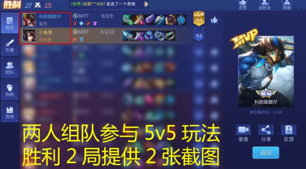 活动期间,两人(不限身份、性别、年龄甚至物种)组队参与任意5v5玩法(不限于排位、天梯等玩法),只需满足相关活动条件并在推送中“腾讯问卷”小程序提交合规截图认证即可获得官方送出的520温暖人心礼包~