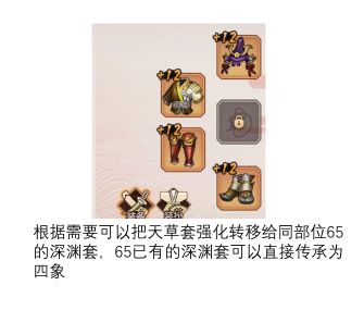 (ps:萌新玩家可以跳过传承步骤,凑足抗魔值后直接用四灵玉佩兑换四象套的部件,可以省略掉传承的麻烦环节;回归玩家则是可以利用强化转移,在60版本天草套的基础上进行打造,这样也不会浪费掉已有的强化基础)