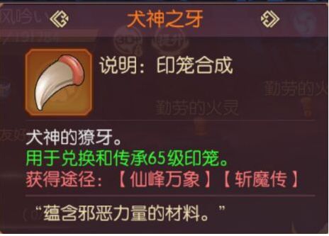 左右槽的材料在斩魔和仙风副本均有产出,左槽材料是犬神之牙右槽材料是夜刀神之角。60级普通左右槽可以用这两种材料分别传承为65左右槽,当然具体的传承方式游戏里都有说明,这里仅帮助帮你盘点材料的获得方式以及如何快速成型。