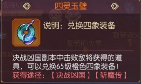 追赶攻略:四象套的传承材料是四灵玉佩,凶国副本产出,每周三次凶国加四次斩魔副本最多可以获得46个四灵玉佩哦!四象套的改造材料是对应部位的宝珠,可以用对应属性的装备碎片和橙色晶体合成。