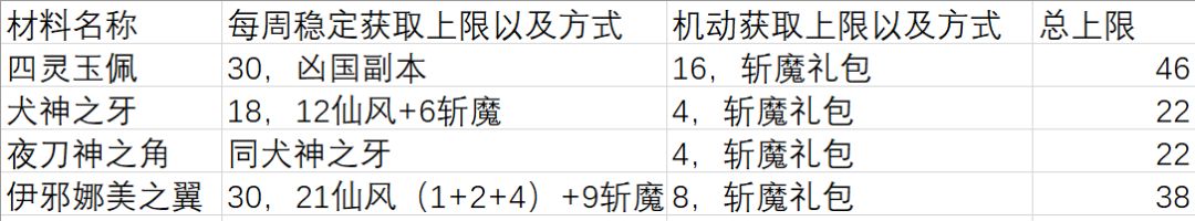 因为斩魔副本的加入,材料的获取就变成了两部分,一部分为稳定获取的材料,一部分机动获取的材料,而且在每个副本的boss攻略任务完成时也会有一部分材料的给予。下面我们先看周四到周日斩魔副本给予的机动材料。