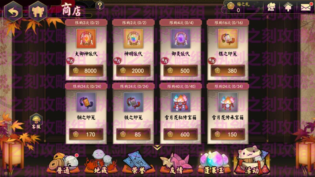 【梅之札】可在活动商店兑换SSR武器、SR武士、限定道具等。