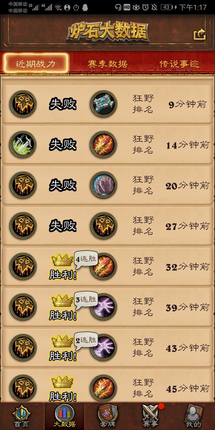 当你感觉自己一直连胜找到感觉时,你的制裁就来了。偶数萨内战对面掏出八爪鱼,奇数瞎找到两张恶魔形态,甚至奇数瞎还带喷灯破坏者针对偶数萨,德鲁伊六费过穿牌库下回合换家。玩中速一直遇到控制,换otk就遇到快攻。