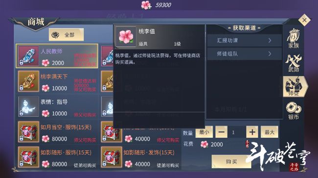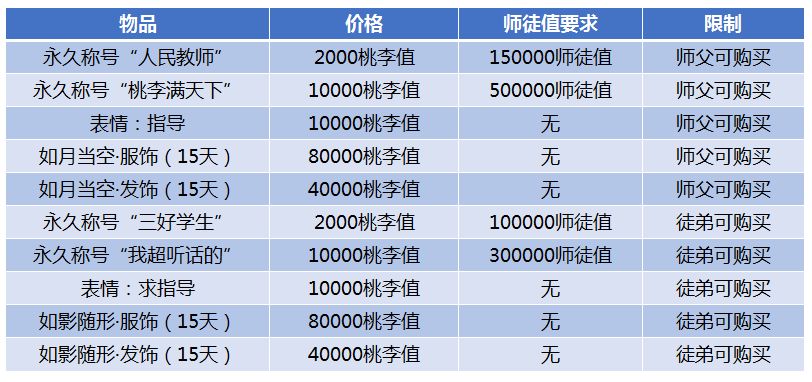 在师徒商店中,有些物品只能师父购买,有些物品则只能徒弟购买。“桃李满天下”与“我超听话的”这两个称号可以永久增加属性和斗气值。