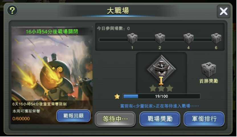 战场在每周一周五5:00 13:00 21:00(UTC+8)开放三次,每次持续2小时,玩家可以在开放时在线实时报名参与