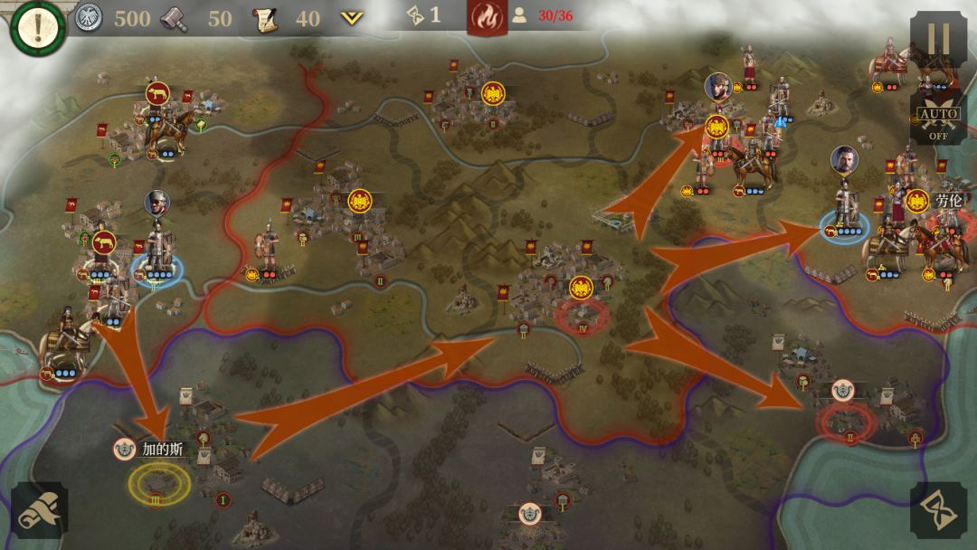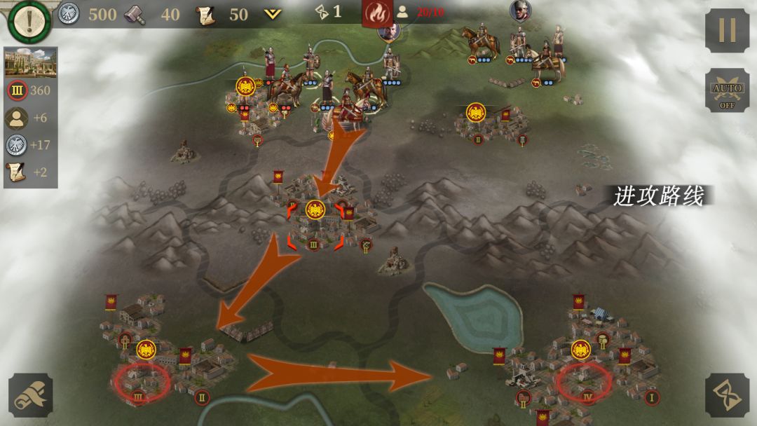 第二回合敌人会发生内讧,开局所有单位向罗马三城最中间的那个城进攻(那个城没有守军),攻下之后留一队主力在最右边的关键地区待命,其他部队向左边进攻,没几回合黎塞留死亡,右边城镇守军会进入混乱状态让玩家收割战果,占领最右边关键地区后造几个兵防守,其他人向左边推进就可以了。攻击顺序从左至右4个关键地区:左3+左4→左2→左1。