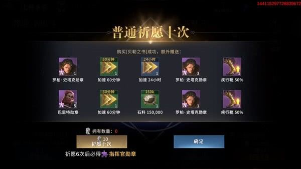 在进行普通祈愿时,领主除了获得贝勒之书,还可获得额外的随机奖励。每次祈愿的额外奖励会从普通祈愿奖池中进行随机抽取。同时普通祈愿达到10次时,必得指挥官勋章。