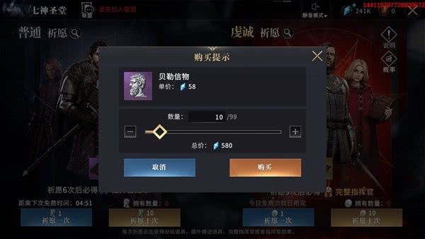 免费普通祈愿次数消耗完之后,再进行祈愿则需要消耗水晶购买贝勒信物,方可继续祈愿。贝勒信物售价58钻石/个,如果领主想要进行批量祈愿,建议使用祈愿十次按钮,进行批量祈愿操作。