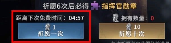 点击祈愿按钮则是进行祈愿,普通祈愿有祈愿一次和祈愿10次。系统每天赠送5次免费祈愿次数。免费祈愿使用后,需要等待5分钟方可恢复一次免费祈愿,系统在每天5点重置免费普通祈愿次数。