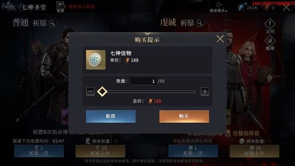 领主点击七神之书下方的祈愿按钮,可进行虔诚祈愿。虔诚祈愿在每天5点刷新一次免费祈愿次数。免费祈愿次数消耗之后,领主再次进行虔诚祈愿,每次需要消耗188金券。