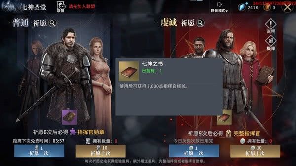 虔诚祈愿下方是七神之书、虔诚祈愿按钮,七神之书使用是可获得3000点指挥官经验,其效果是贝勒之书的6倍。