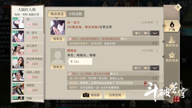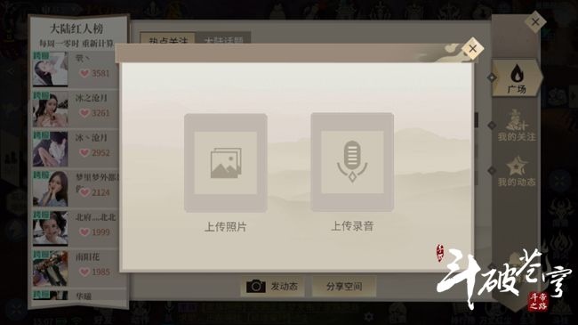 点击“发动态”即可在斗气大陆上发布动态消息,选定大陆话题选项就代表已参与该话题,点击“+”符号可以在动态中插入图片或者录音。录音为直接录制,时长限定为3—60秒之内,不可上传音频文件,喜欢唱歌的斗者们快来展示一下你们的歌声吧。