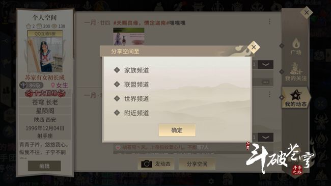 点击“分享空间”可以将个人空间分享至家族频道/联盟频道/世界频道/附近频道,至少选择一个频道进行分享,也可以全部选择。选中想要分享的频道点击确定后,会在该频道发布一条消息,其他斗者可点击该消息直接进入你的个人空间,对发布的动态进行点赞、评论。