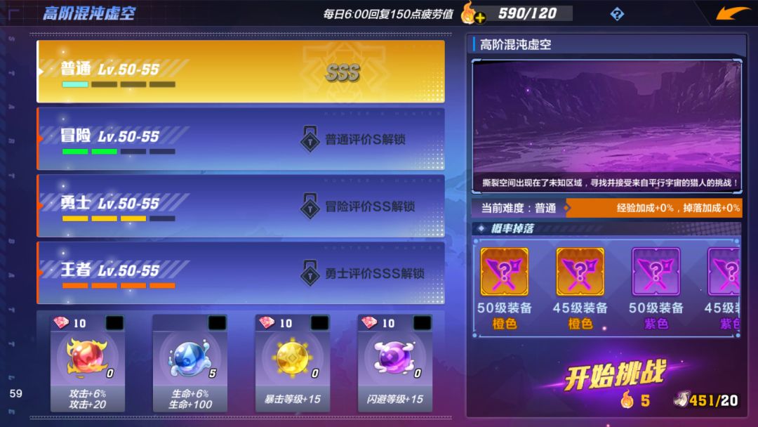 与其他副本相同,高阶混沌虚空也没用次数限制,只需要消耗疲劳值与更多的许可证即可挑战,开启下一难度需要当前难度一定的评分要求。副本主要产出45-50级史诗以及紫色以下装备,也会产出大量银河之心。选择祝福效果可以大大提升自己的属性值。