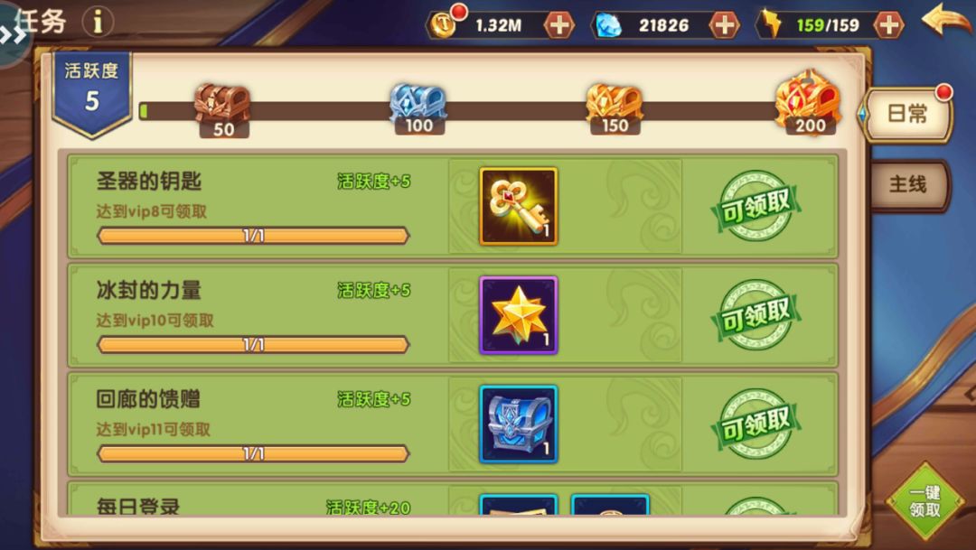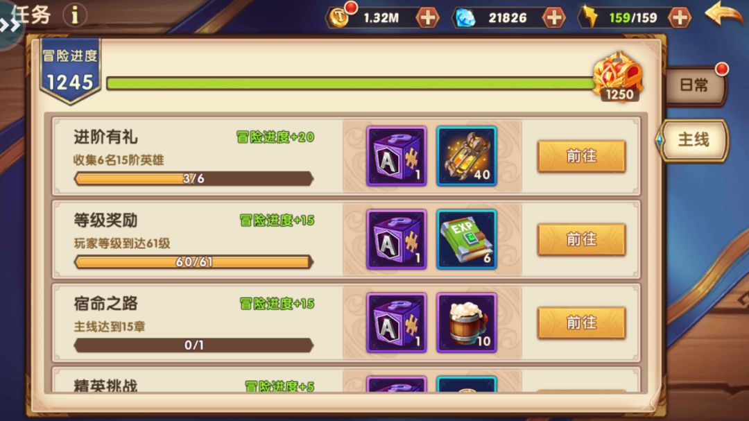 主线任务:它是一系列只能完成一次的任务,每完成一个主线任务,即可获得一定冒险进度,进度达到一定值即可打开大宝箱获得丰厚奖励