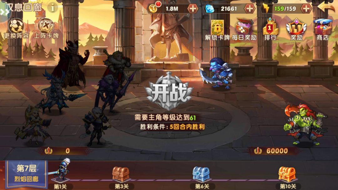 1、每层分为普通关卡和特殊关卡,普通关卡胜利后掉落普通道具。特殊关卡胜利后掉落普通道具并额外获得卡牌宝箱,可领取不同卡牌