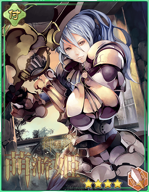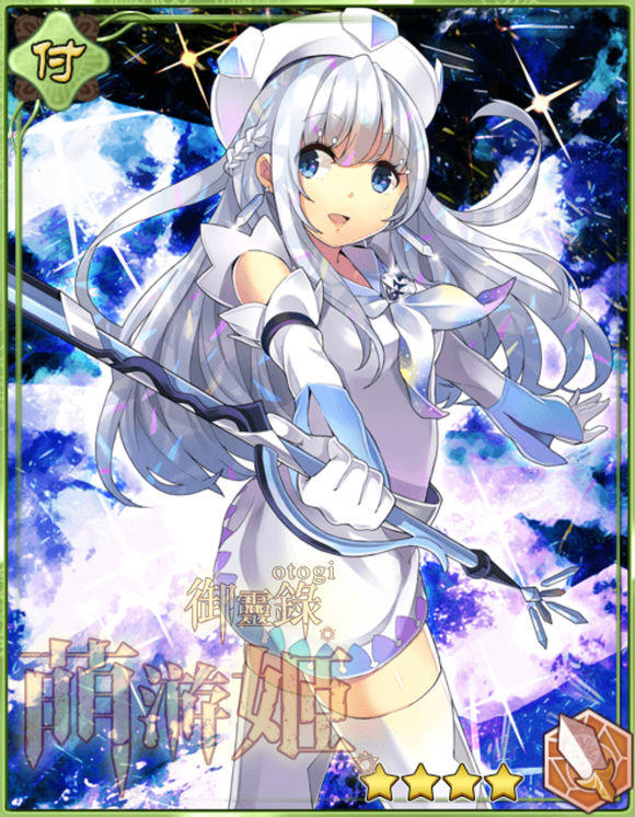 简评:卡面非常好舔(无误),ATK在4星里属于比较高的,主动技能是对己方前排进行治疗,能提高前排的生存能力,主动技能和被动技能能显著提升队友攻击频率,变相提高输出。如果你卡组里带了3个前排那么这张卡还是不错的。