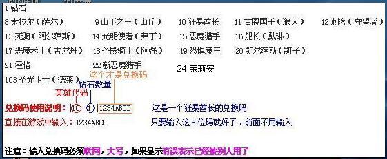 兑换码:输入后8位,字母大写,一个兑换码只能用一次,如果别人用过了,你再用就会显示兑换码错误;兑换码前面有英雄编号,具体看图片。
