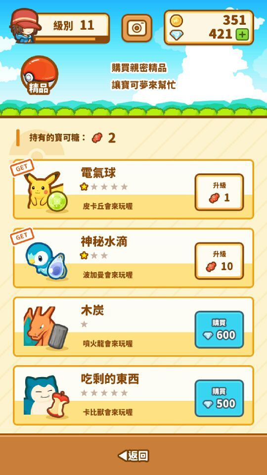 可以用货币购买其他的口袋妖怪伙伴和以口袋妖怪为原型的装饰品,皮卡丘和喷火龙都是可以入手的,喷皮党头顶青天!