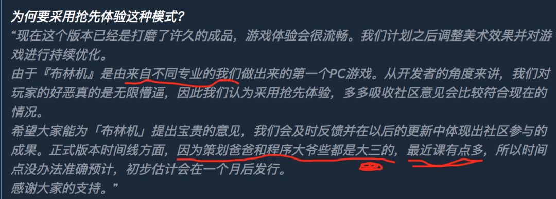 第一眼看到的是《布林机》还处于抢先体验状态,前面有一段开发者的话。
