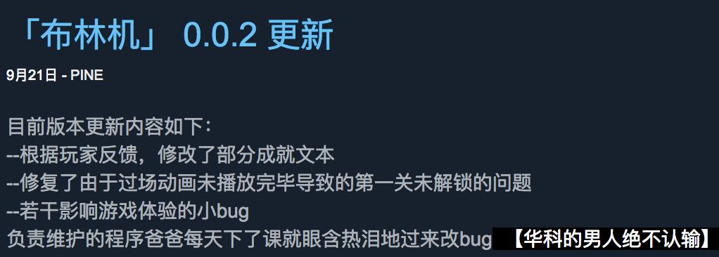 关上Steam页面,我好奇而隐秘地潜伏进布林机的玩家群,发现制作人Pine和程序爸爸的日常是这样的…