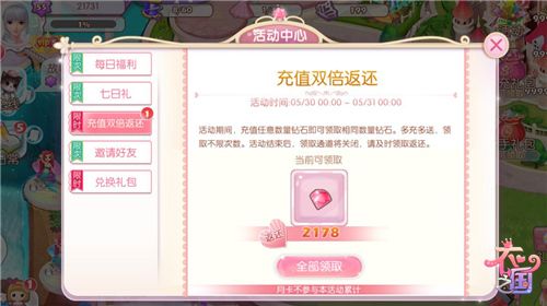 作为一名勤俭持家的少女,怎能错过“充值双倍返还”如此强大的投资的活动呢~6月1日当天,进入游戏内充值钻石,即可获得双倍奖励,充值越多,送的也就越多哦!机不可失,赶快来吧!