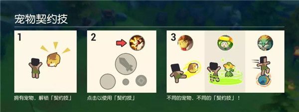 在战斗中,出战宠物会提供一个可手动释放的主人和宠物合体的契约技能。不同类型宠物,合体技能的效果完全不同,有伤害、嘲讽、回复、控制等多种效果。除了合体技能外,宠物在战斗中也可以使用自己的专属技能。