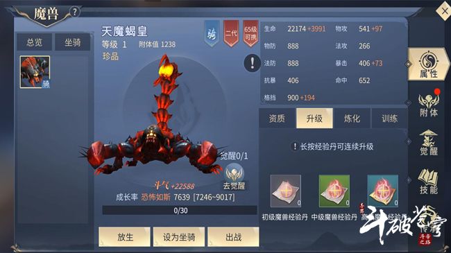 天魔蝎皇的附体值较高,作为附体魔兽也可以为主人增加较多的斗气。附体值是由魔兽的品种、成长率和训练等级决定的,训练等级每提升一级可以增加9点附体值。
