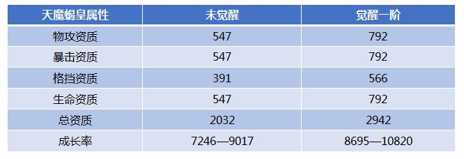 觉醒一阶的天魔蝎皇总资质与觉醒二阶的紫晶翼狮/食日火狐相同,总资质都是2942;觉醒一阶的天魔蝎皇最高成长率是10820,而觉醒二阶的紫晶翼狮/食日火狐最高成长率是10609,相差200多点,同等级下天魔蝎皇所增加的斗气会比紫晶翼狮/食日火狐高5000以上。