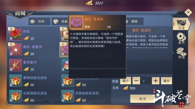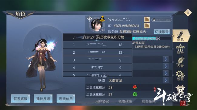 随着情缘系统的上线,又开启了一个新的功能——送花。斗者可以将鲜花送给本区的任何人,若对方是您的好友,则会增加亲密度,并且在个人信息页面可以看到历史收花积分和历史送花积分。