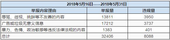 五月第3,4周的总举报量为32406条,实际处理量为8088条,举报成功率仅为24.96%