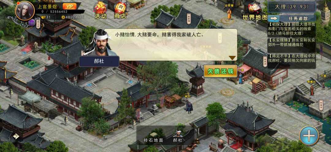 来到屋外与林郎直接切磋,敷衍几句之后开打,打服林郎,回去找元天霸商量,他也是愿赌服输。元家问题解决了,还要去找地头蛇向家。去向府找向齐天,不得不说向府就是有排面,不愧为钟鸣鼎食之家。进去与向齐天老爷子交谈,可老奸巨猾的向老爷子表示生意不景气,少侠一身好武艺只要帮我追回那些赖账人的欠款,保护费老夫再也不收了。自己倒是古道热肠,继续帮忙,欠条中两人为天雄帮帮主与郝杜(好赌),在大理(39,93)处找到郝杜,郝杜模样颇为落魄。好像也有难言之隐,原来是被高利息贷款害的(我寻思你一身好武艺为何不远走高飞?),不帮他出是情理之中,帮他出是侠者仁心,(在这里不帮出钱不会扣掉自己30W铜币,帮他出会奉上5颗家传的玄天宝丹)。