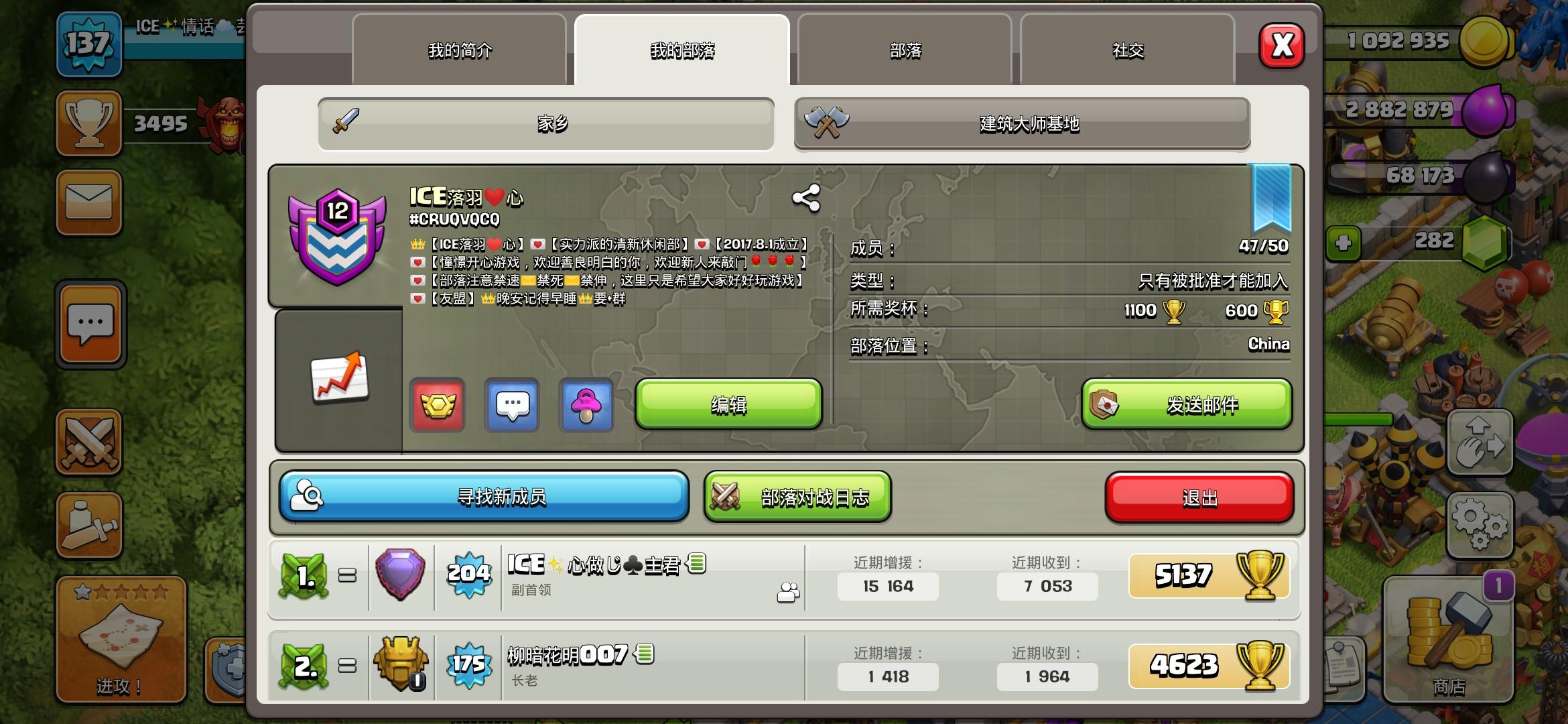最后嘛,玩部落终归是为了开心,我不严格要求大家部落战打的好,但一定不能消极比赛,毕竟对不起其他打部落战的人,大家还是想赢的,部落战频率不太高。一星期俩次大概。玩游戏始终不能耽误学习,工作,业余时间其实足够我们的了。联赛的话有人在前面扛,我们比较注重联赛的