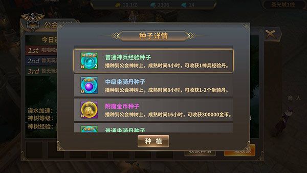 啥是公会神树?说白了就是公会里有一棵树,你可以在上边埋下种子,种子成熟后就可以收获金币、坐骑丹、羽灵等道具。