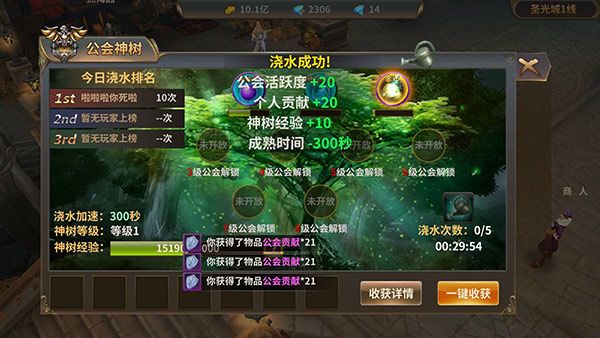 种子种下去之后,浇水可以加速种子的生长。种植和浇水都可以获得公会贡献,贡献可以用来升级公会科技。
