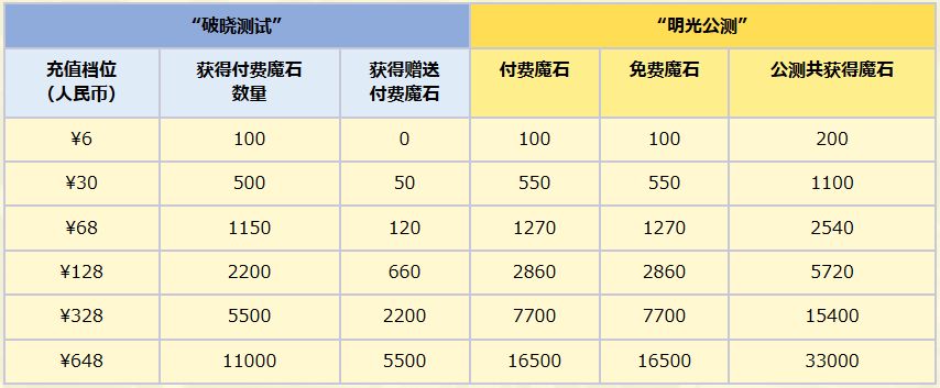在公测活动期间,首次充值购买魔石时,根据各魔石付费档位,将赠送对应额外相同数量的免费魔石!