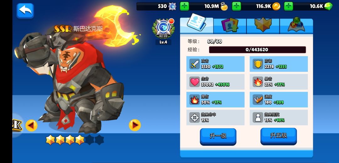 以上是本小主的红色四星斯巴达。主要以速度和暴击属性为主打造,所以输出一般,但因为基本是刀刀暴击,再角斗场的输出也不会太差。在达到6星红2后,老虎速度可以达到440到450左右,也可以更加适应各类副本。