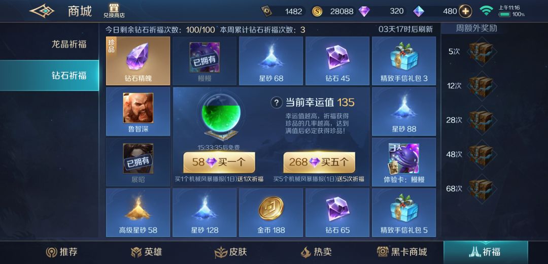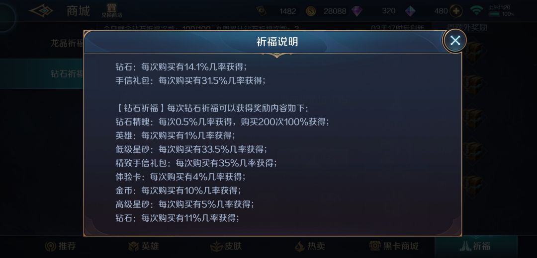 购买200次祈福(40轮5连祈福)必得钻石精魄,换算成钻石为10720钻石(实际没这么多,因为祈福也产出钻石)。在这个过程中还能抽到其他英雄、星沙、钻石、金币、手信等物。