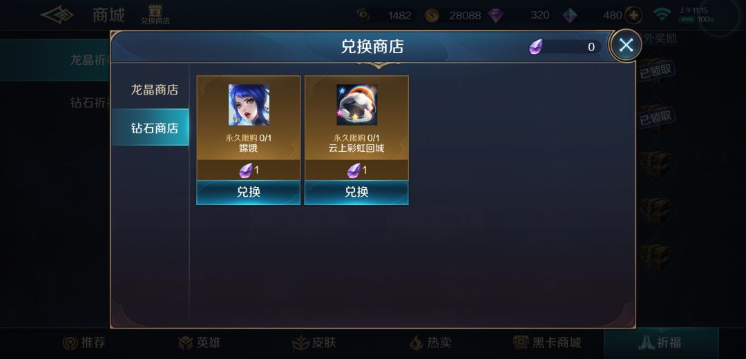 钻石商店:在商城的右下角——祈福中,左上角即可看到兑换商店图标,可用钻石精魄兑换商品(包括但不限于嫦娥)。